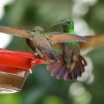 Fights for access to the bird feeder are everyday occurrences. A berylline attempts to intimidate a migrating ruby-throated hummingbird.